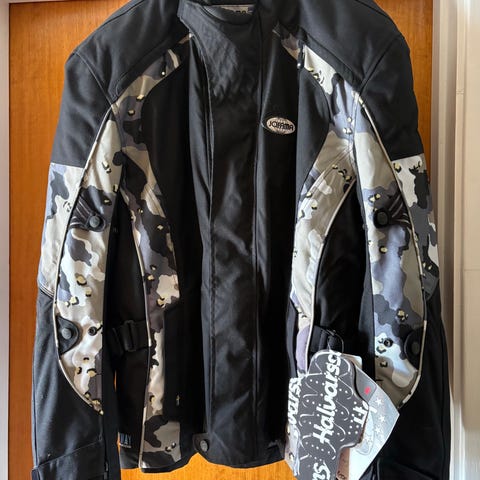 Helt nye Mc-jakker i str.S (herrestørrelse) 2.stk i svart/grønn,/ 2xl og 3xl I modell sort/hvit. Str.52(L)Str.54(xl) i kamuflasje/pris i butikken 1499-1699