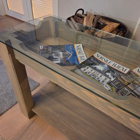Håndsmidd rundt bord (avbildet) med fassettslipt glassplate 10mm tykk selges.