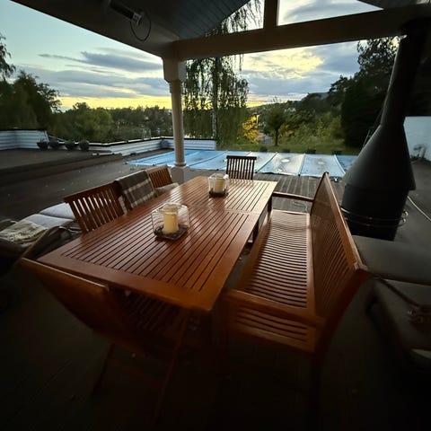 Vi kjøpte disse nydelige teak-stolene i mai 2025, splitter nye rett ut av esken, som en midlertidig løsning i påvente av andre stoler som nå har ankommet. De har kun vært brukt sporadisk gjennom sommeren.