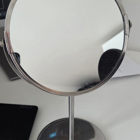 Rundt speil med svart ramme og integrert oppbevaringsboks. Speilet har en enkel design og oppbevaringsboksen består av flere rom for organisering av små gjenstander. Materiale og størrelse er ikke spesifisert.