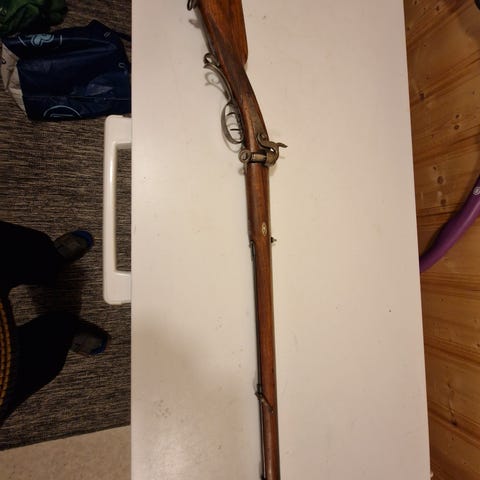 Flott antikk flintlås gevær lengde ca 122 cm tungt og solid gevær.