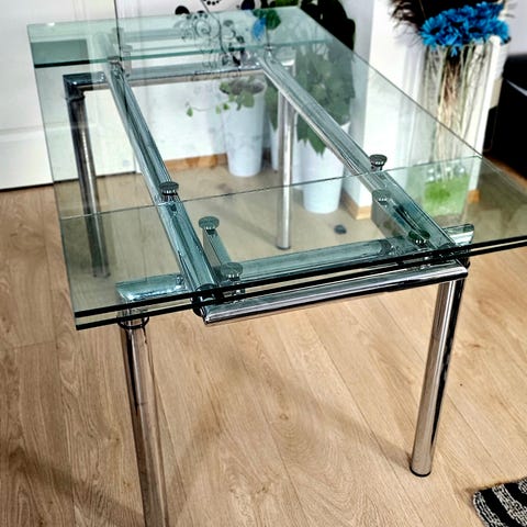 Selger spisebord i glass. Merk: Et hjørne av glassbordet er skadet, men fikset (se bilde). Bordet er stabilt og fullt brukbart.