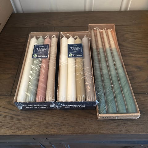 Diverse uåpnede og åpnede pakker med stearinlys.