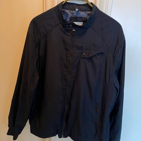 Selger en pent og lite brukt mørkeblå lett jakke fra Redford i størrelse XL, kjøpt på VIC. Jakken har glidelås og knapper foran, i tillegg til lommer på hver side.