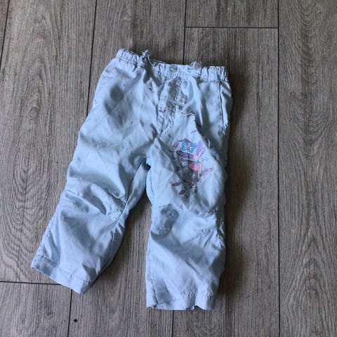 Bukse /m lommer og åpning nederst på¨beina . Noen år gammel .