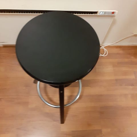 Selger denne flotte stolen fra Neolt Italy. Kan justeres i høye (ved å snurre på stolen). På det høyeste er det ca 78 cm fra gulvet (totalhøyde med rygg ca 111 cm), og på det laveste, ca 61 cm (totalhøyde med rygg ca 94 cm). Mål på setet: ca 40x43 cm. Ryggen kan også justeres (se bilder). Har blitt trukket om med et pent mørkegrått stoff (tror det er bomull). Må hentes i Oslo.