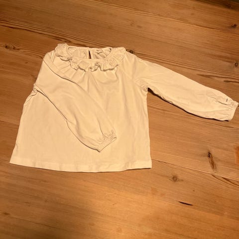 Genser, genserjakke, hvit med blondekrage, til gutt eller jente. Blonder nederst på ermene. Knyting.