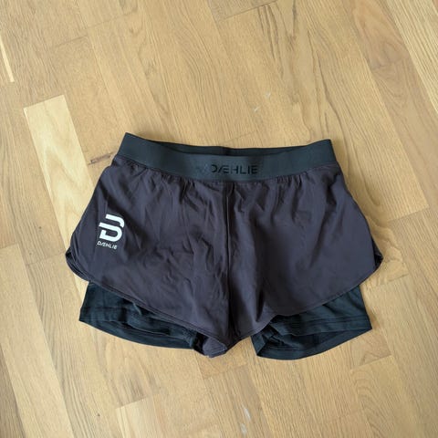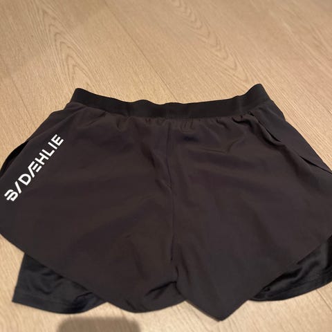 Dæhlie løpeshorts for dame i størrelse M. Modellen har en tettsittende innershorts og en løsere yttersjorts i lett materiale. Shortsen er egnet til løping og annen trening. Farge: svart/mørk grå. Elastisk linning gir god passform, og plagget er laget i teknisk stoff som tørker raskt og gir god bevegelsesfrihet.