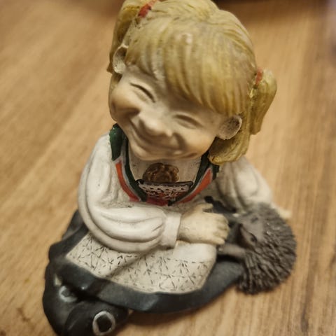 Man med brun jakke med hette over hodet som varmer seg ved et bål og blå motorsykkel. Størrelse på skulptur: 13x8x8,5 cm. Figuren ser hel og fin ut.