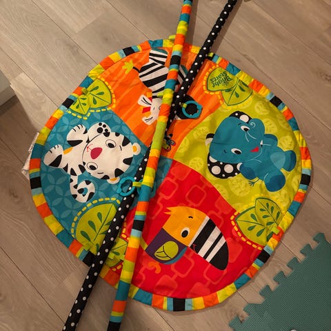 Pent brukt babygym i rolig og fersk myntegrønngfarge. Minimalistisk og stilren design for deg som liker enklere ting og samtidig ønsker en babygym der baby kan slappe litt av mens den trener litt og ikke blir superstimulert før for eksempel leggetid. Sikkerhetsspeilet har litt riper. Ingen andre feil og mangler