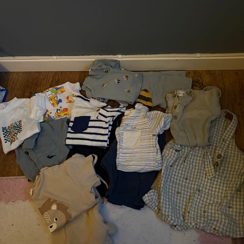 Det er blanding av klær, yttertøy og sko i str 74 og 18/19.