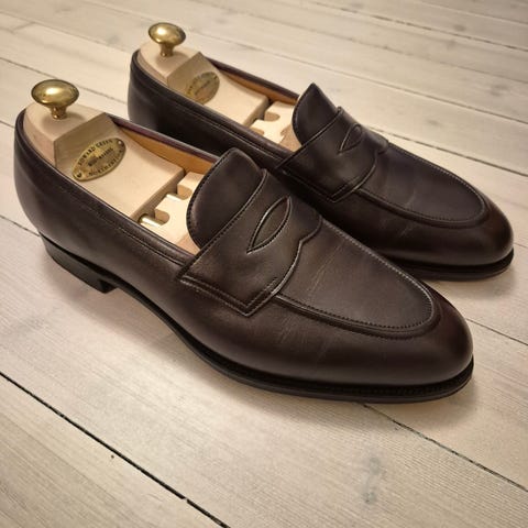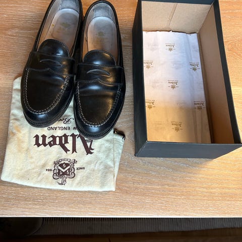 Alden størrelse 12E. Modell 6243F, Penny Loafer Unlined Vamp. Snuff suede. 12E. Pent brukt.