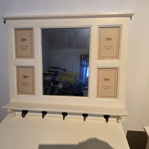 Hylle med tre knagger. Det er også mulighet for å sette inn to bilder, samt skrive på tavlen med kritt.