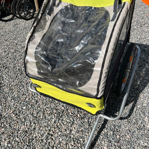 Komplett sykkelhenger. Brukt en gang på tur i Italia. Fremstår strøken. Ingen rust. Oppbevart innendørs. Medfølger drybag for oppbevaring av klær og annet utstyr. Stålramme.