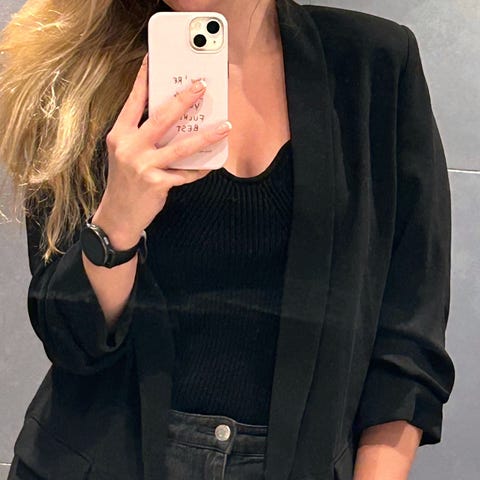 Pent brukt søt, svart topp str 40 i satenglignende/blankt stoff. Pen bord på bryst, V-åpning hals.