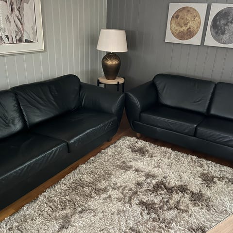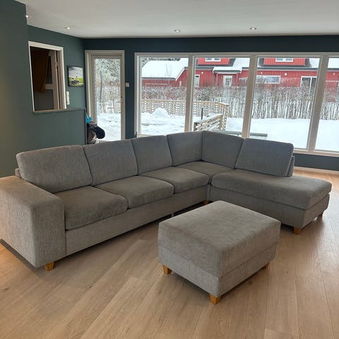 Skinnet er helt og stort sett pent, normal slitasje enkelte steder. Alle setene kan reclines. Et av setene har vært litt kranglete. Vi fikset det med strips, og det fungerer helt fint igjen. Sofaen kan enkelt deles i tre deler ved flytting: treseter, hjørne og toseter. Må hentes, vi kan eventuelt hjelpe til med utbæring.