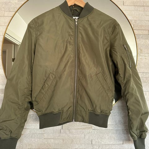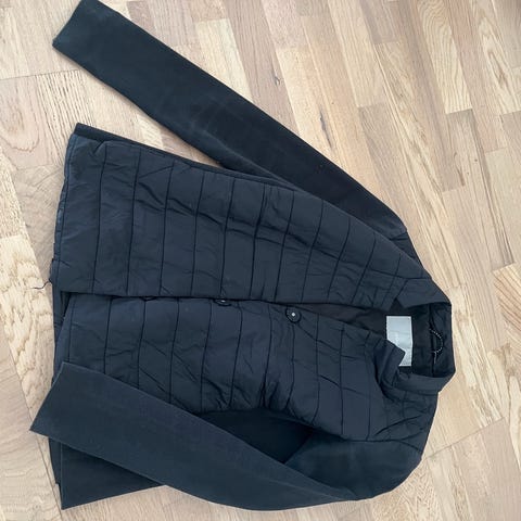 Selger en lett vattert jakke i gul/grønn farge. Kort og feminin modell med glidelås foran, to glidelåslommer og høy krage med trykknapp. Perfekt til vår og høst – passer fint både til bukser og skjørt. Brukt, men i god stand.