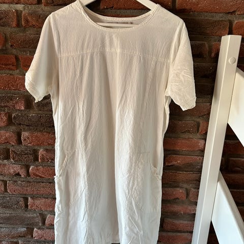 Kul og morsom Ofelia kjole str M mørk blå med prikker i ulike blåfarger og hvit, grønn farge i sider, ytteest på ermer og i halslinning. 95% viskose, 5 % elastan, stretch I stoffet, mykt stoff. Vid kjole. Knelang. Maskinvask 30 grader, kan strykes. Nattkjole eller sommerkjole det er opp til deg