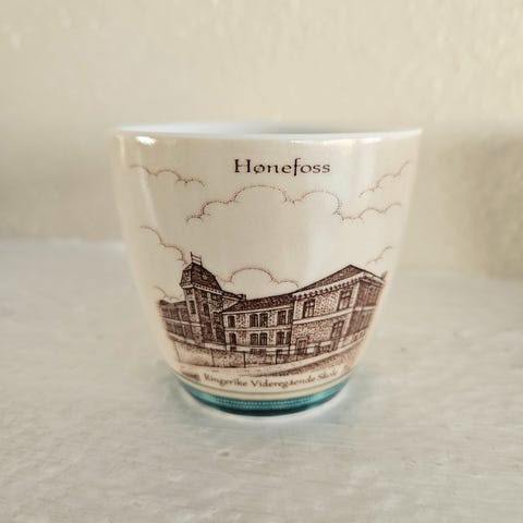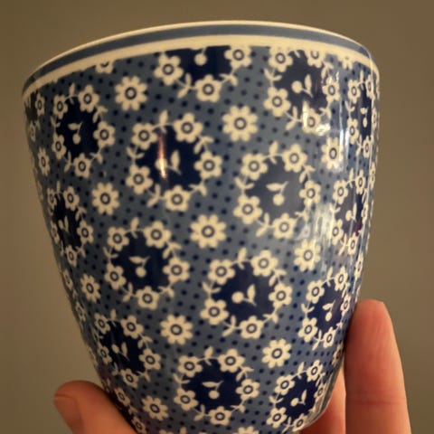 Selger et nydelig sett med 4 keramiske kopper og 1 skje . Perfekt til te, kaffe eller som koselig pynt på kjøkkenet.