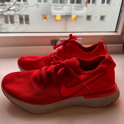 Nike løpesko i størrelse 42, designet for løping. Skoene har en grå og hvit fargekombinasjon med et pustende materiale for komfort under aktivitet.