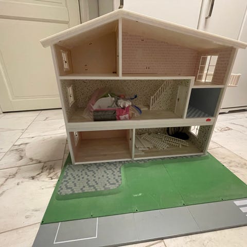 Dukkehuset er i grei stand, men taket har fått seg et merke på ene siden, og den ene lille veggen manglet når vi kjøpte huset brukt, så vi har laget egen at tykk papp (den hvite)