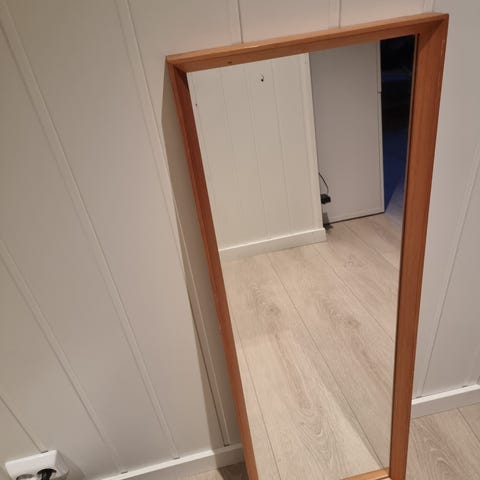Gammel speil i hel tre ramme. Mål: 131 x 37,5 cm