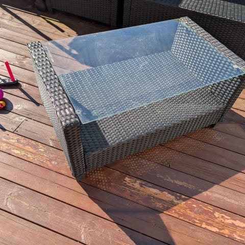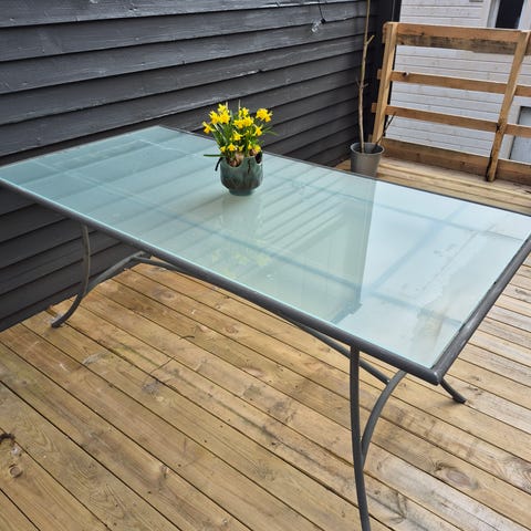 Hagebord med glassplate og metallramme. Bordplaten er laget av glass og rammen har en solid konstruksjon. Passer godt til hage eller terrasse.