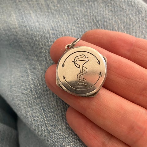 Medaljong/kapsel i rustfritt stål, henger i et 56 cm langt kjede.