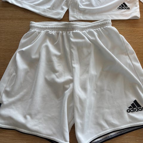 Fin treningsshorts i hvitt fra Adidas, i løs passform, påsydd Adidas-merke og sort kant ved låret 🤍