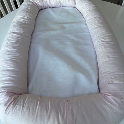 Voksi babynest. Det er brukt av tre barn og har naturlig slitasje, svak misfarging i hoderegionen, men fungerer bra. Må hentes