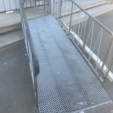 Aluminiumsrampe, spesiallaget etter mål; ytre kant 90cm, indre kant 80cm, lengde 2m, har en festekant med to plugger under (se bilde), er brukt til å frakte europaller, men kan også brukes til rullestol