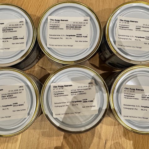 Jeg selger maling 500 kr 10 l bøtte, følgende farger: , vennlig rosa 2 stk, space 1 stk, soft touch 1