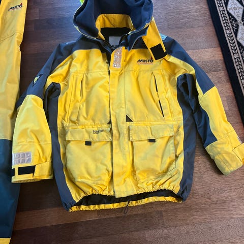 Jakken og buksen har blitt minimalt brukt, men har vært med og tilgjengelig på seilturer noen ganger. Har ellers hengt i bod. Jakken har ikke det utagbare fôret. Størrelse medium i bukse, og large i jakke. Nypris var i overkant av 10.000 kroner.