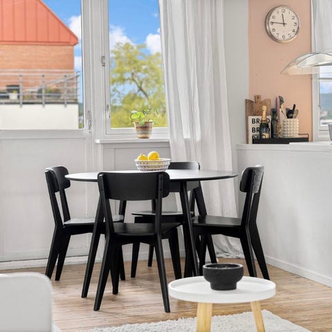Er plas folie på toppen av bordet under den er borde svart «eik»