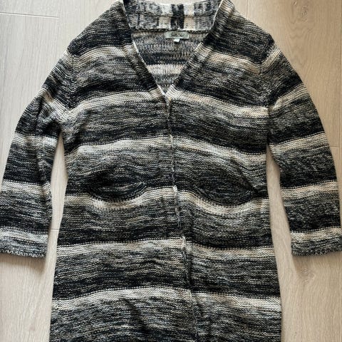 Pent brukt cardigan / strikkejakke fra Anette Stai sin kolleksjon. Stoffet er behagelig og garnet er en blanding av beige, grønt, hvitt og gull ✨