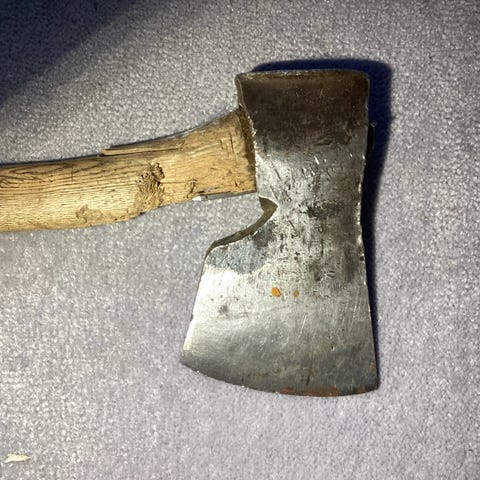 Tysk Pionier øks. Ingen synlige stempler. Skaftet er ikke originalt, men passer godt.
