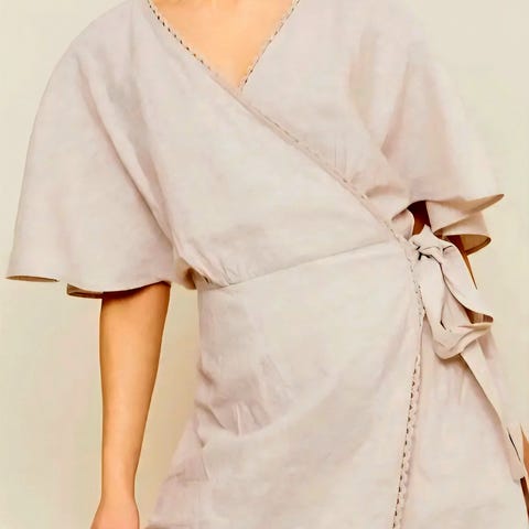 Kjolen har rund hals med v-formet frontåpning, kort erm med oppbrett, og splitt med gullknapper sidene. Kun brukt et par ganger.