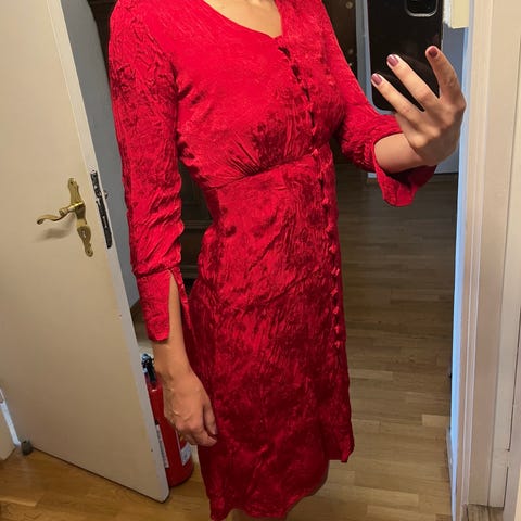 Kjole til spesiell anledning i størrelse S. Den har noen flekker og vanlig slitasje, samt er et par av paljettene litt løse, men de er ikke i fare for å falle av.