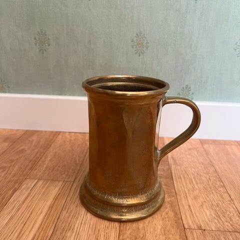 Messing kopp i belagt materiale med dekorativt lokk og solid håndtak. Koppen står på tre stilige føtter og har en elegant design som passer til klassiske borddekorasjoner. Perfekt for servering av sukker eller små søtsaker.