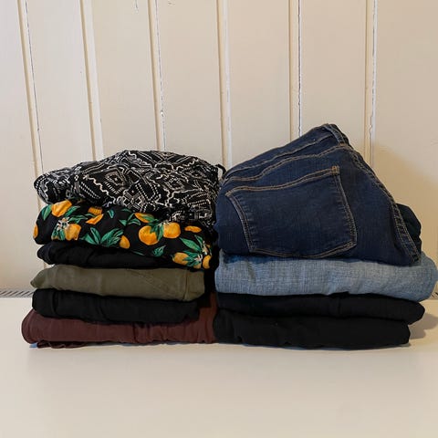Gravidklærpakke som inneholder to jeans, yogabukser, tights, strømpebukser og omslagsgenser.