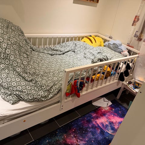Selger seng, gardiner (sorte/mørk grå med 🐾) og madrass. Ingen flekker ol. Røyk og dyrefri