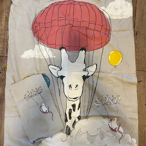 Søtt sengetøy med giraff, passer dynestørrelse 65x80 cm. (Putetrekk til 35x40 cm pute følger med.) Pent brukt, kan ikke finne noen bruksmerker, men det kan forekomme. Litt skrukkete etter å ha ligget nedpakket en stund. Kjøpt på Kid.