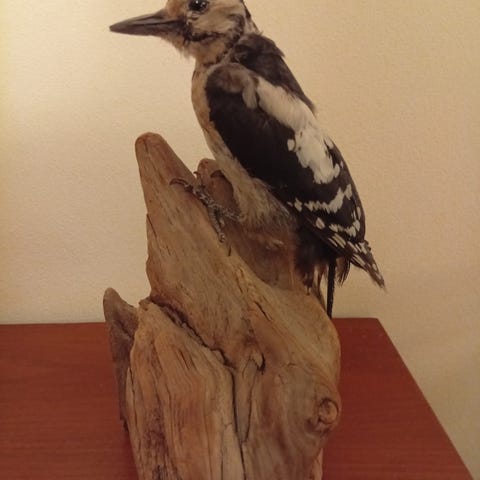 Selger et utstoppet Grønnspett par. Arbeid utført av Trofemonasje.