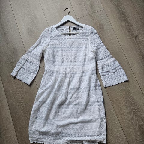 Nydelig hvit blondekjole. Foret i skjørtet, og har skjulte knapper.størrelse 38, men synes den er liten. Mer 36.