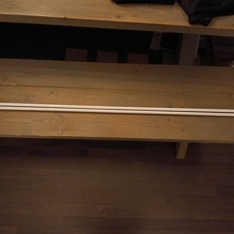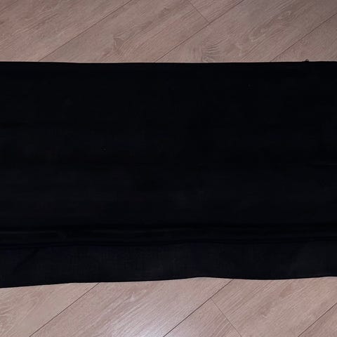 Lystett rullgardin, lys grå på innsiden og sølvfarget på utsiden. Er en del år gammel, men har ikke blitt brukt de seinere år. Ingen skader, men noen merker etter oppheng til snora på nederste del.