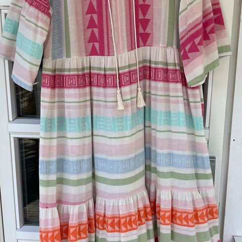 Maxi kjole, god vidde, viskose, nydelige farger, knappestolpe oppe, volangermer 3/4.