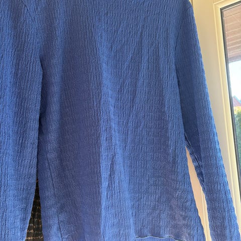 Pent brukt Vavite bluse/topp. Lysblå og hvit mønstrete, «boble» stoff. Liten knapp bak i nakken.