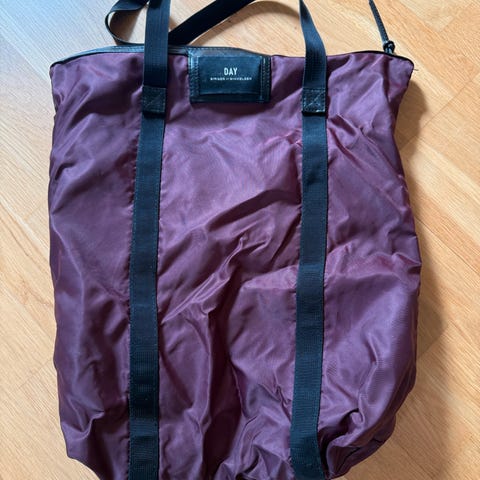 Skinnsekk, mørkbrun, "trekantet" fasong. Skulderreim har glidlås og kan derfor brukes som både veske og sekk.