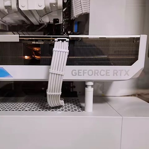 Robust GPU-holder / støtte til skjermkort. Fargen er svart, børstet stål. Toppen kan skrues slik at høyden justeres mellom 7 cm og 12 cm. Har gummi-belegg på endene slik at den står stabilt mellom kabinettet og grafikk-kortet.