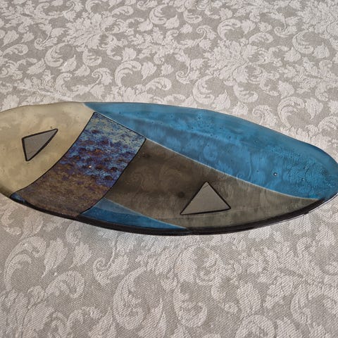 Fatet er laget av presset glass med frukt- og boblemønster, og har tre separate seksjoner for servering av ulike matvarer.